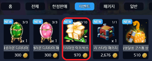 ※ 프리미엄 럭키 박스 구성품의 획득 확률은 [공식 홈페이지] - [상점] - [확률] 탭을 통하여 확인하실 수 있습니다.