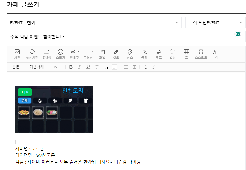 - 공식 카페 [슈퍼럼블 이벤트] 탭의 [EVENT - 참여] 게시판에 스크린샷과 덕담 작성하기 (추석 덕담EVENT 말머리 사용)