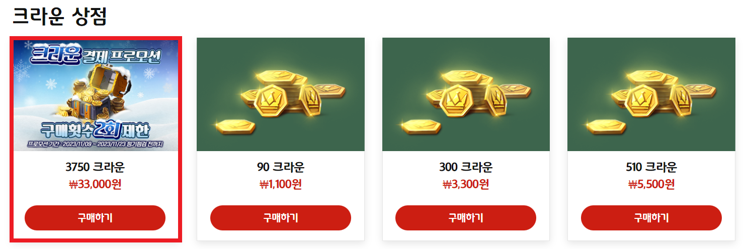 크라운 결제 프로모션 상품은 [공식 홈페이지] - [상점]에서 확인 가능합니다.