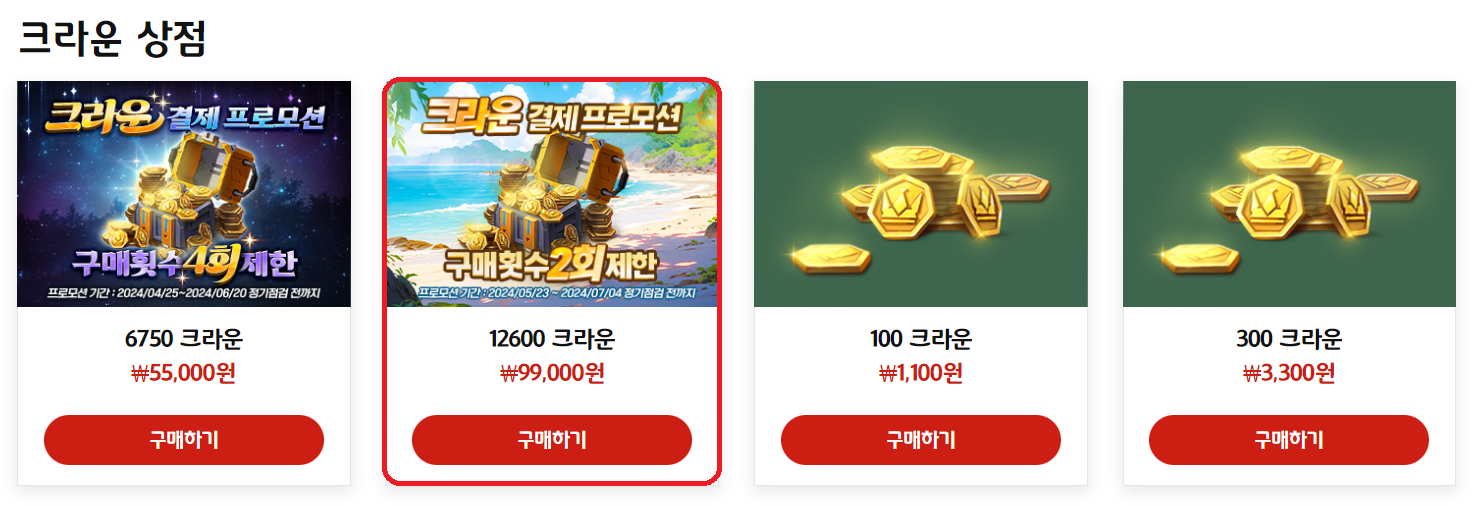크라운 결제 프로모션 상품은 [공식 홈페이지] - [상점]에서 확인 가능합니다.