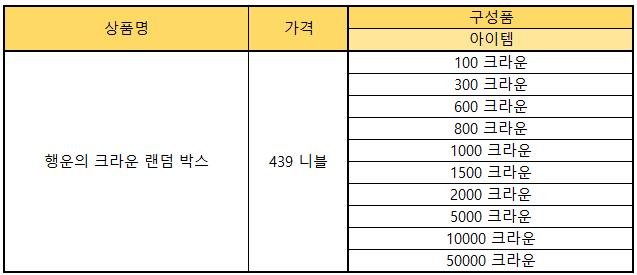 > [행운의 크라운 랜덤 박스]의 자세한 확률은 확률공개 탭을 확인해 주시기 바랍니다.