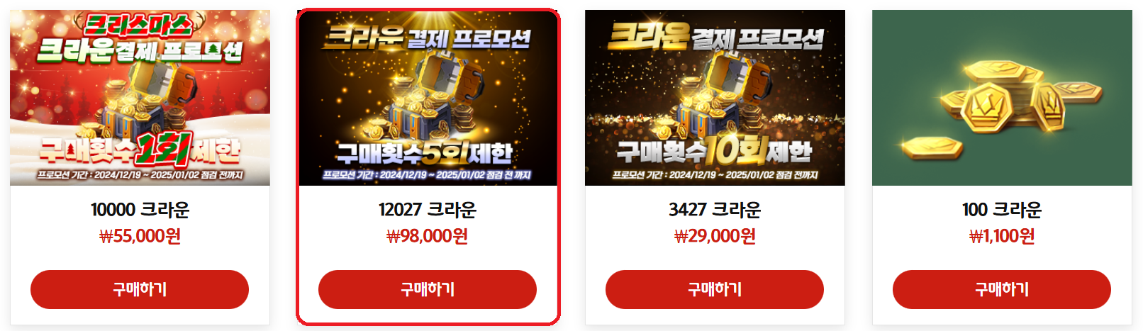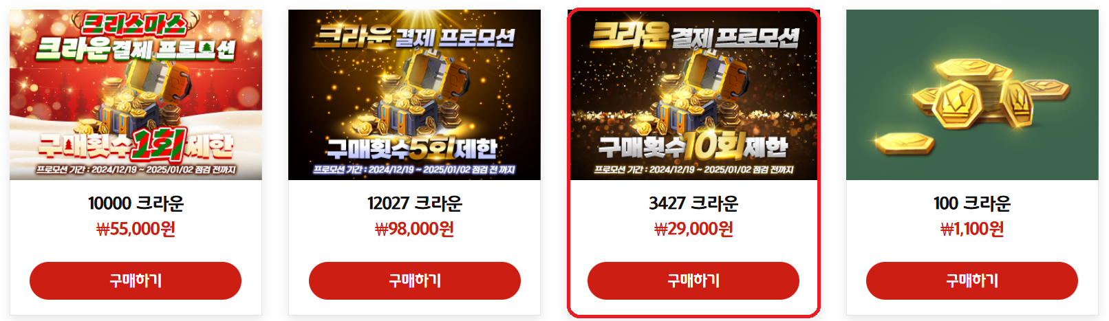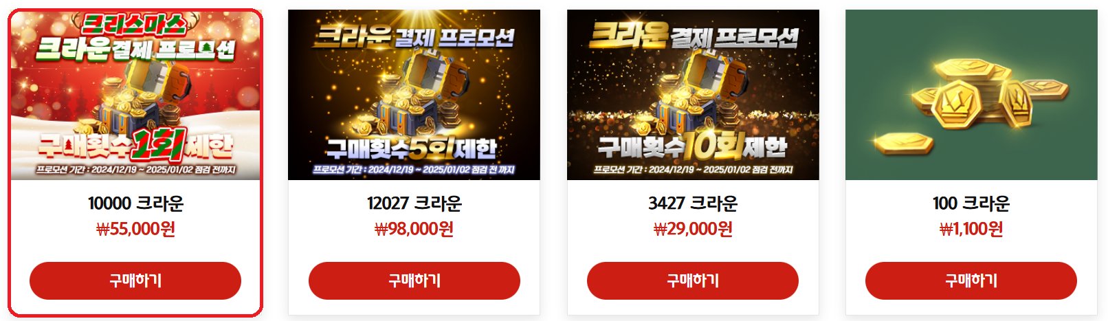크라운 결제 프로모션 상품은 [공식 홈페이지] - [상점]에서 확인 가능합니다.
