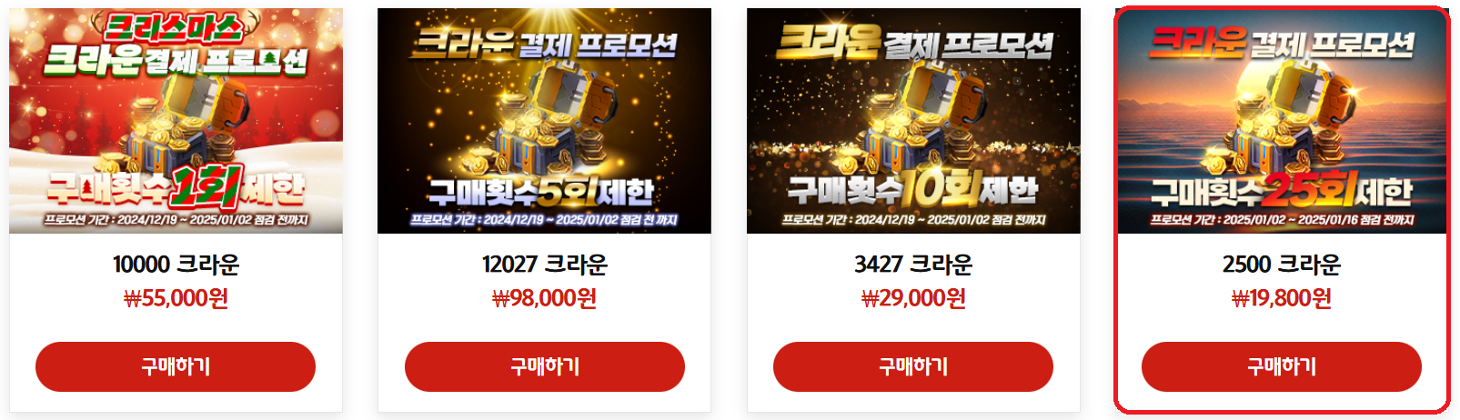 크라운 결제 프로모션 상품은 [공식 홈페이지] - [상점]에서 확인 가능합니다.