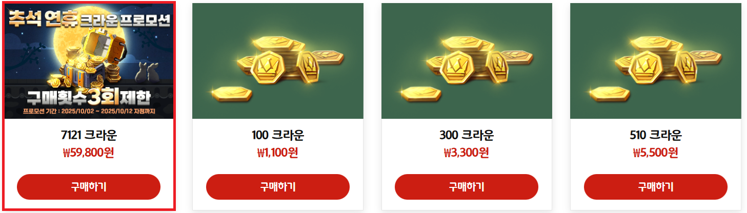 크라운 결제 프로모션 상품은 [공식 홈페이지] - [상점]에서 확인 가능합니다.