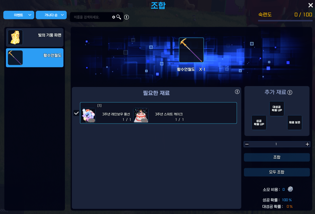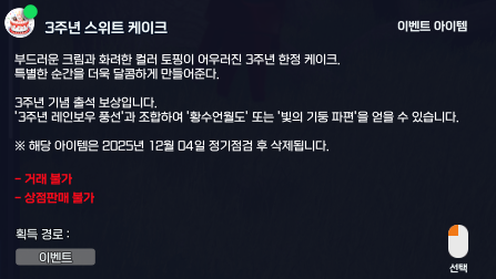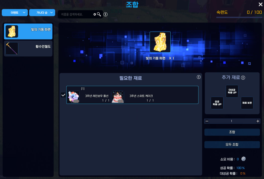 - 2개의 조합법과 7일차 보상 아이템인 '3주년 레인보우 풍선'과 '3주년 스위트 케이크'를 모두 획득하였다면,