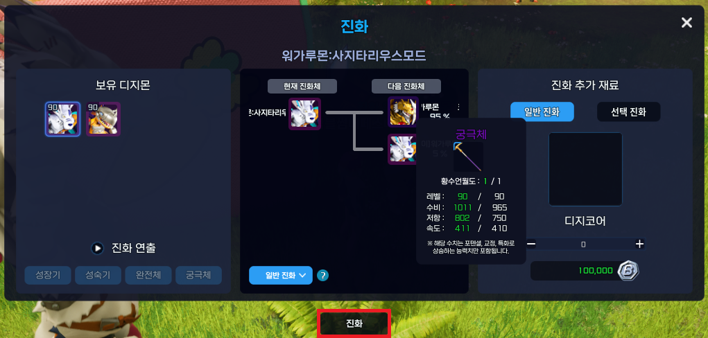 - 진화 조건을 충족한 상태에서 진화 버튼 클릭!