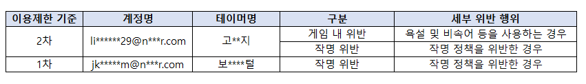 [운영정책 위반계정 명단 및 사유]