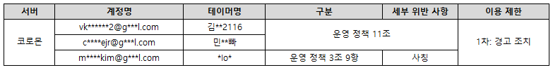 지난 주말동안의 신고건이 다수 발견되어 확인 후 진행된 운영정책 위반 계정 제재를 안내드립니다.