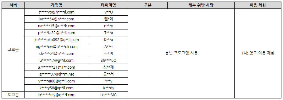 지난 계정 제재 위반 목록 안내 이후 접수된 문의 내 확인된 운영정책 위반 계정 제재를 안내드립니다.