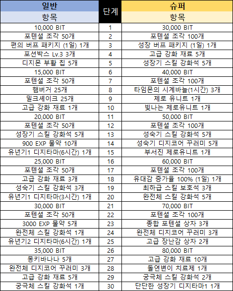 적용 월드 버프 : 비트 획득량 25% 증가 + 디지몬 경험치 획득량 30% 증가