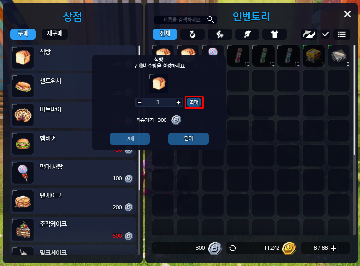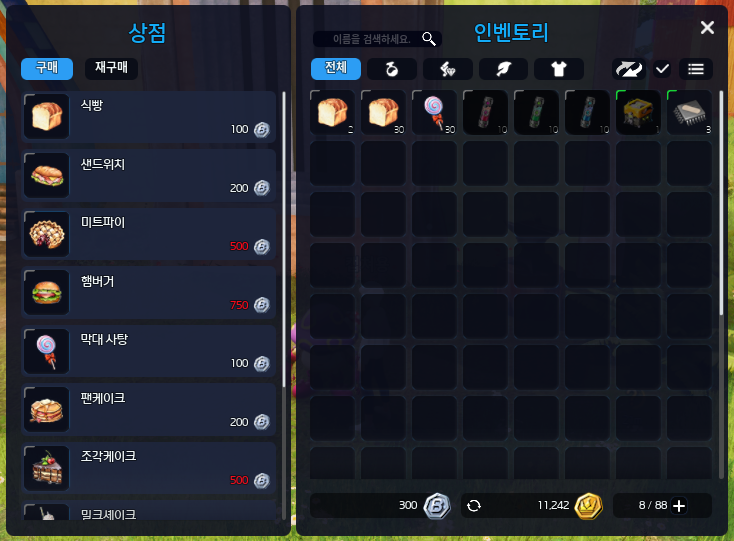내용 : 상점에서 재화가 부족하여 구매할 수 없는 품목은 가격이 빨간색으로 표시됩니다.