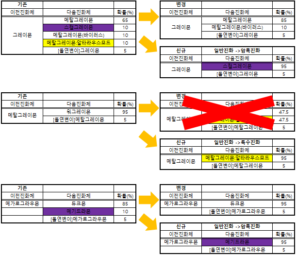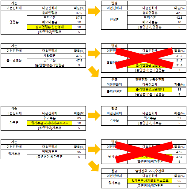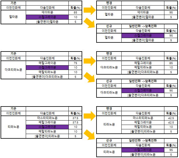 진화타입 변경으로 일부 디지몬의 진화트리와 확률이 변경되었으며, 자세한 내용은 아래와 같습니다.