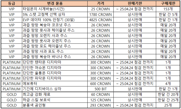 - VIP 상점에 신규 판매 물품이 추가됩니다.