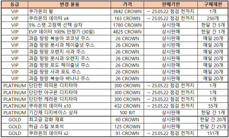 적용 기간 : 2025년 05월 08일(목) 점검 후 ~ 2025년 06월 05일(목) 점검 전까지
