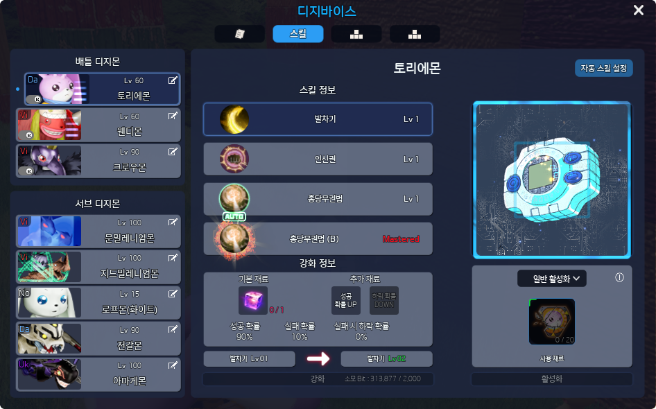 - 지정된 스킬이 디지바이스 내에서 아래와 같이 표시됩니다.