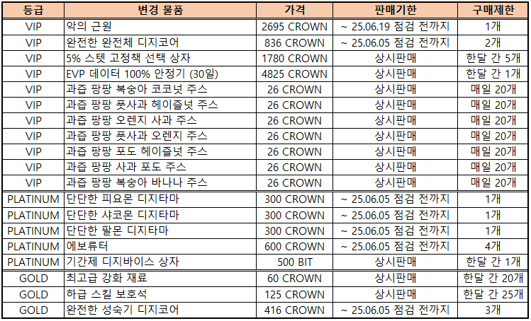 - VIP 상점에 신규 판매 물품이 추가됩니다.