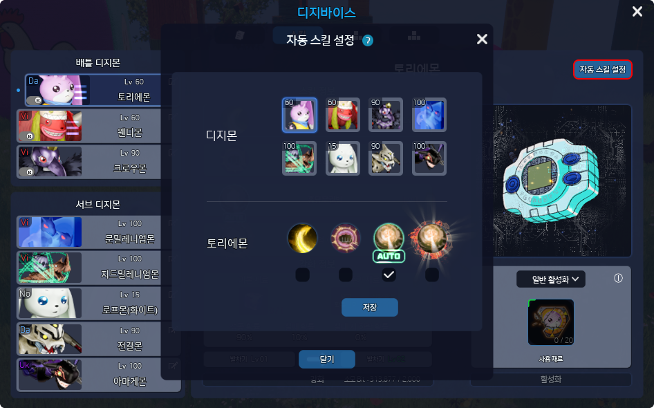 - 디지바이스의 스킬 탭에 위치한 ‘자동 스킬 설정’ 버튼을 통해 설정 화면으로 진입할 수 있습니다.