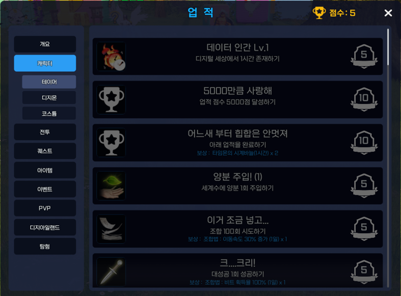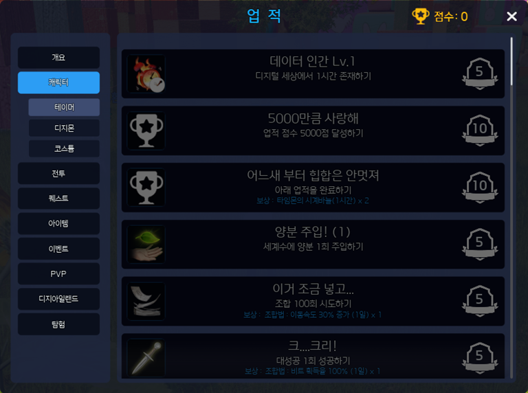 내용 : 디지몬 획득 관련 신규 업적이 추가됩니다.