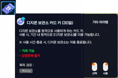 내용 : ‘디지몬 보관소 카드 키’아이템을 사용해 디지몬 보관소를 원격으로 사용할 수 있습니다.