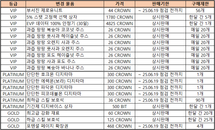 - VIP 상점에 신규 판매 물품이 추가됩니다.