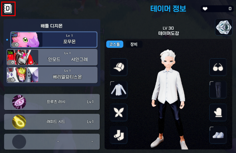 원격 디지몬 보관소는 메뉴 - 디지몬 보관소를 통해 사용할 수 있습니다.