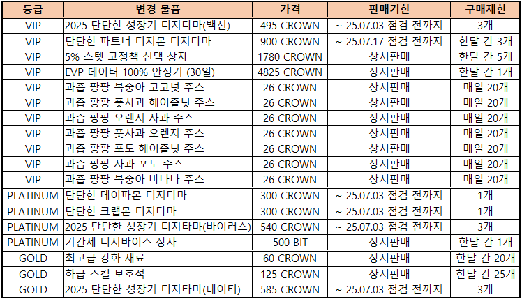 - VIP 상점에 신규 판매 물품이 추가됩니다.