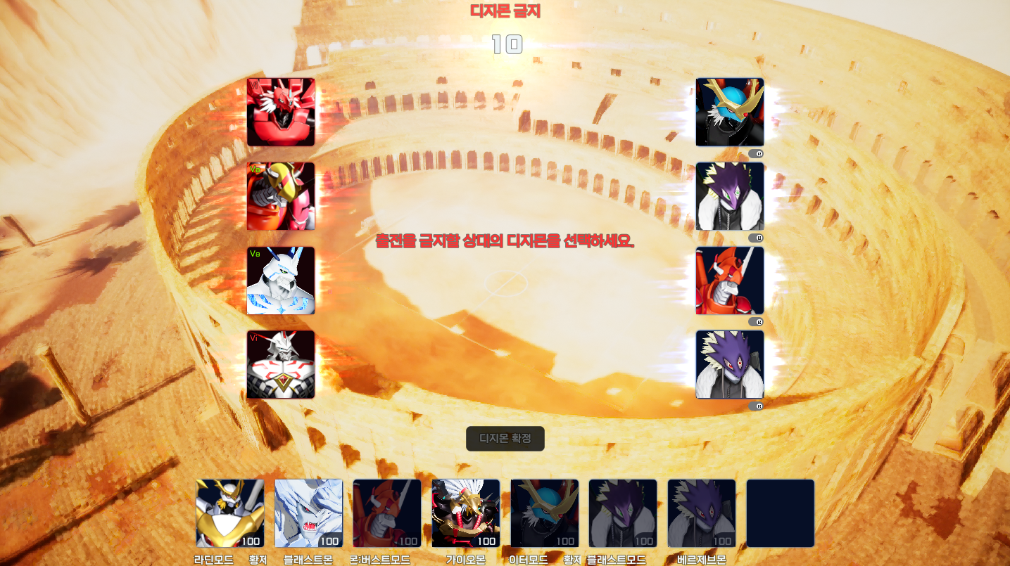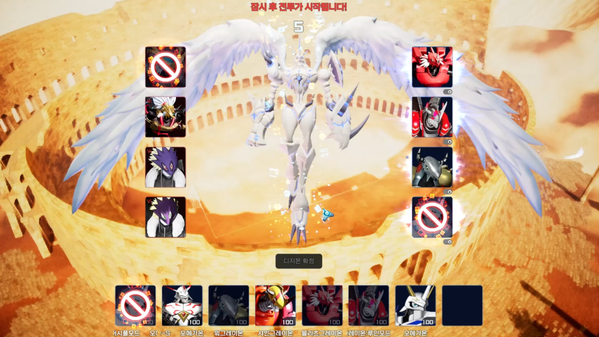디지몬 금지 페이즈 시 상대가 선택한 디지몬 중 하나의 디지몬을 선택한 후 ‘디지몬 확정’ 버튼을 클릭해 디지몬 금지를 진행할 수 있습니다.