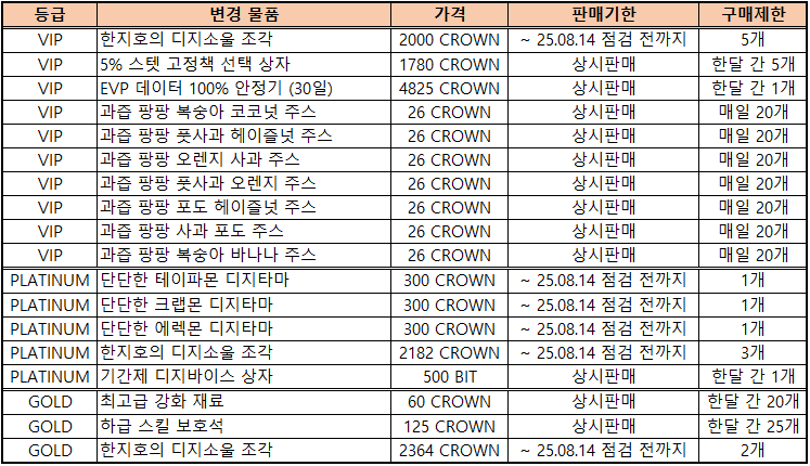 - VIP 상점에 신규 판매 물품이 추가됩니다.