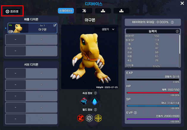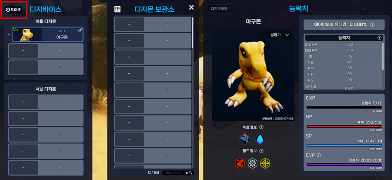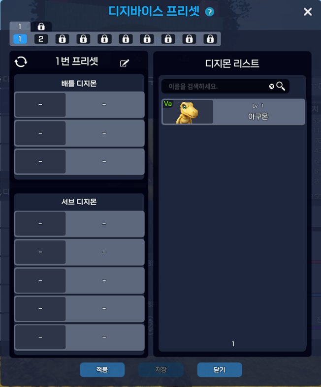 ※ 디지몬 보관소에 공간이 부족할 경우, 프리셋을 적용할 수 없습니다.