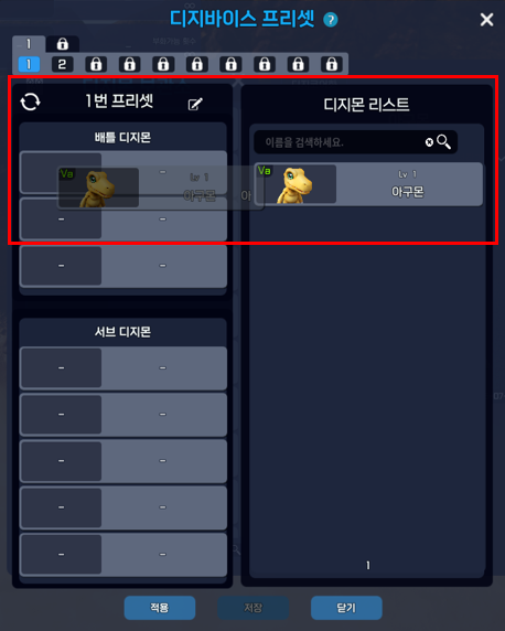 원하는 프리셋을 선택한 뒤, 화면 우측의 디지몬 리스트에서 마우스 우클릭 또는 드래그를 통해