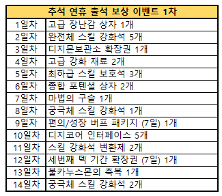 내용 : 한가위를 맞아 이벤트 기간 동안 접속 이벤트가 진행됩니다.