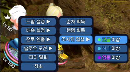 파티장이 파티 메뉴의 드랍 설정 탭에서 주사위 입찰 여부와 주사위 입찰이 발동되는 아이템 등급을