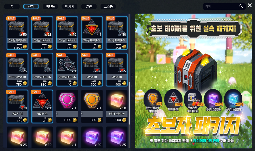 - 빛나는 제로유니트 25개 : 1500 → 750