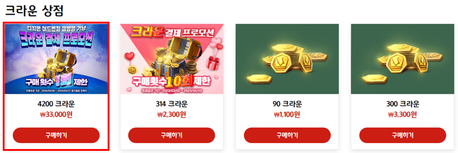 크라운 결제 프로모션 상품은 [공식 홈페이지] - [상점]에서 확인 가능합니다.