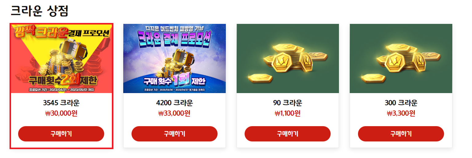 크라운 결제 프로모션 상품은 [공식 홈페이지] - [상점]에서 확인 가능합니다.