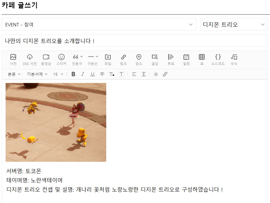 - 이벤트 종료 후, 특색있고 재미있는 컨셉의 디지몬 트리오를 소개한 20명을 대상으로 보상 지급