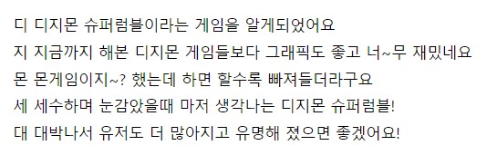 지난 5월 4일부터 5월 17일까지 '디지몬 신춘문예' 이벤트가 진행되었습니다. 참여해주신 모든 테이머님들께 다시 한번 감사드리며, 센스있고 감동적인 디지몬 문예작품을 제출해주신 10명의 테이머님을 정말 어렵게 선정하였습니다. 선정된 테이머님들 모두 축하드립니다 !