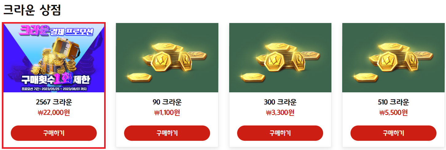 크라운 결제 프로모션 상품은 [공식 홈페이지] - [상점]에서 확인 가능합니다.