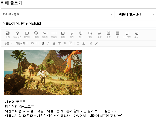 - 공식 카페 [슈퍼럼블 이벤트] 탭의 [EVENT – 참여] 게시판에 자신만의 여름을 보내는 팁을 함께 작성하여 이벤트 참여하기