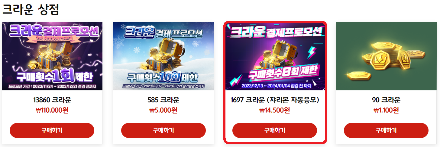 크라운 결제 프로모션 상품은 [공식 홈페이지] - [상점]에서 확인 가능합니다.