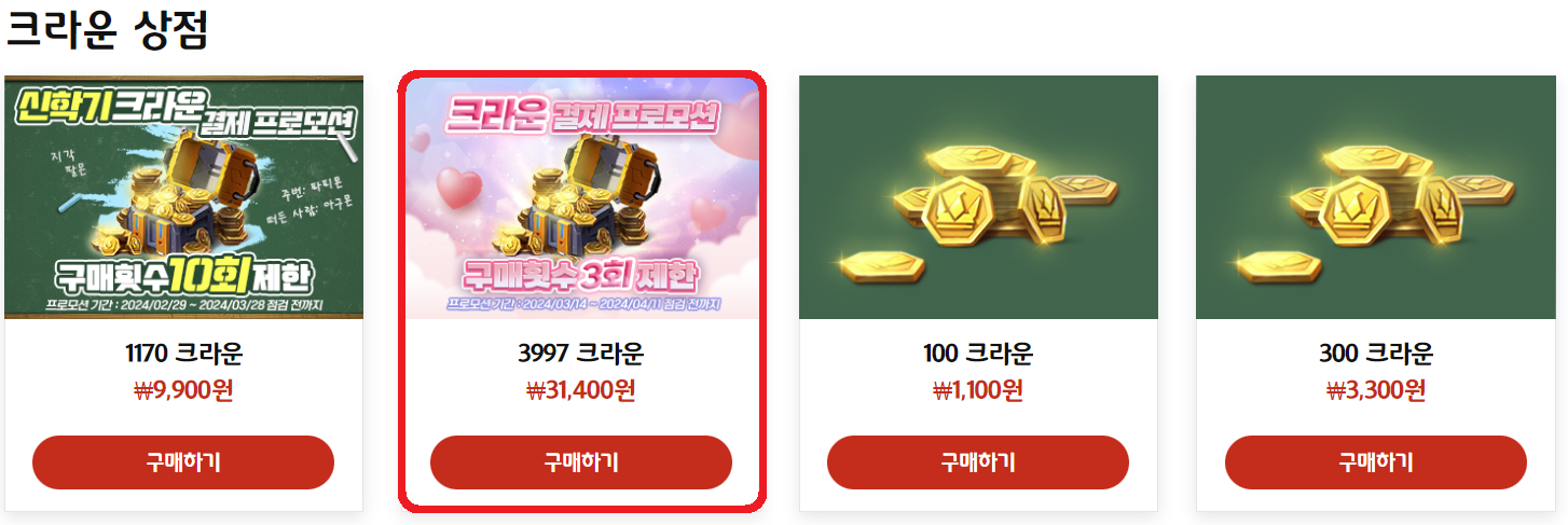 크라운 결제 프로모션 상품은 [공식 홈페이지] - [상점]에서 확인 가능합니다.