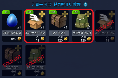 ※ 2024년 3월 14일 디지몬보관소 확장권, 창고 확장권, 인벤토리 확장권의 재고가 빠르게 소진되어, 구매를 하지 못한 많은 테이머 분들을 위해 판매 시간 부분을 조정하여 재판매를 진행하게 되었습니다.
