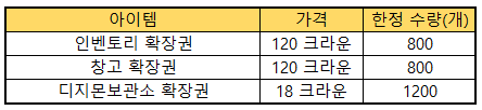 ▶ 한정 판매 아이템 품목 추가(확장권류)