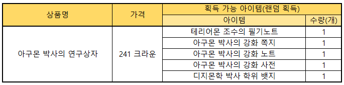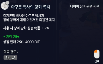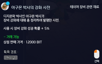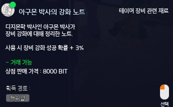 ※ “아구몬 박사의 연구상자” 아이템 사용 시 강화 확률 증가 아이템을 랜덤으로 획득 가능합니다.