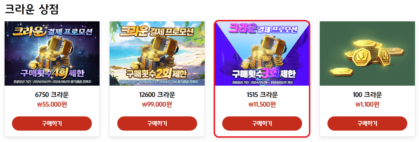크라운 결제 프로모션 상품은 [공식 홈페이지] - [상점]에서 확인 가능합니다.