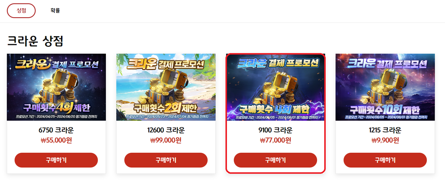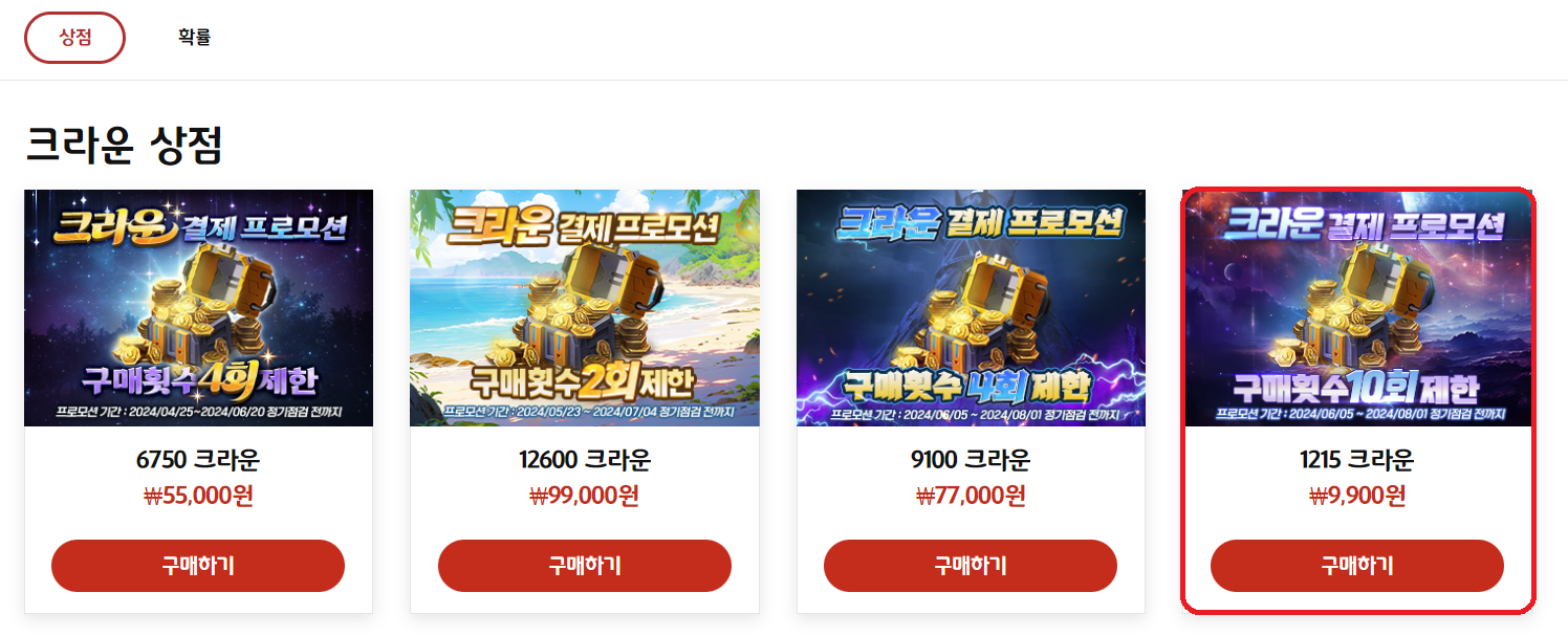 크라운 결제 프로모션 상품은 [공식 홈페이지] - [상점]에서 확인 가능합니다.