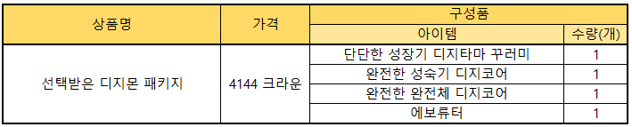 ※ 선택받은 디지몬 패키지는 4주 동안 1회 구매 가능합니다.