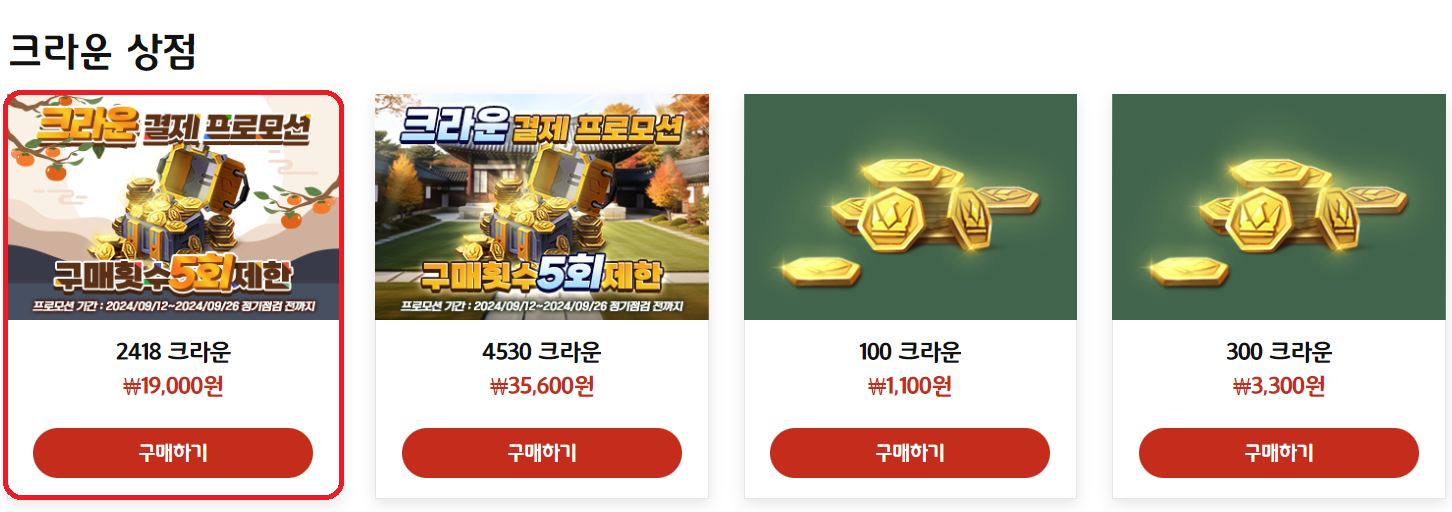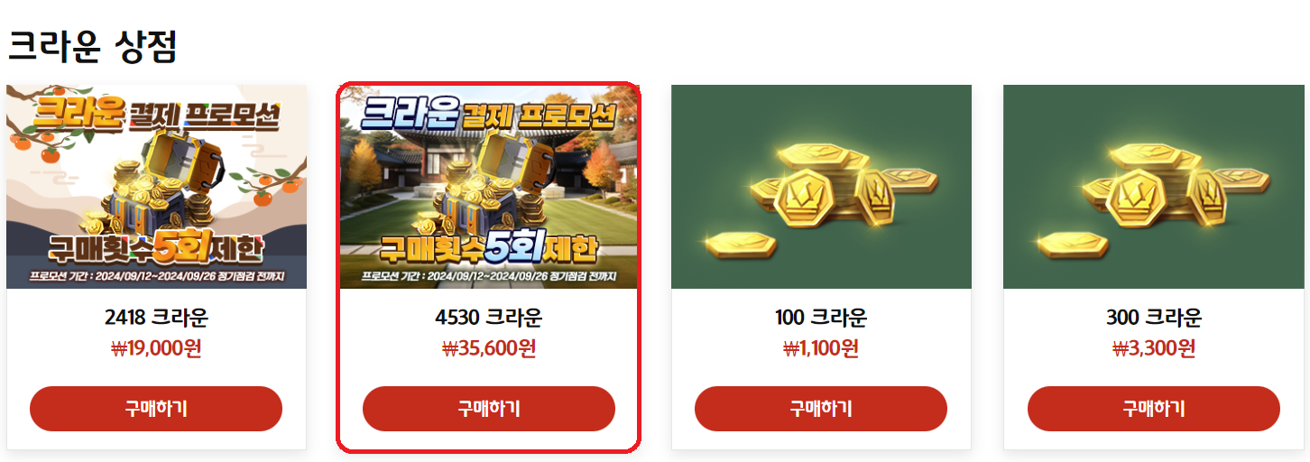 크라운 결제 프로모션 상품은 [공식 홈페이지] - [상점]에서 확인 가능합니다.