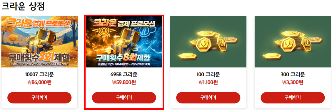 크라운 결제 프로모션 상품은 [공식 홈페이지] - [상점]에서 확인 가능합니다.