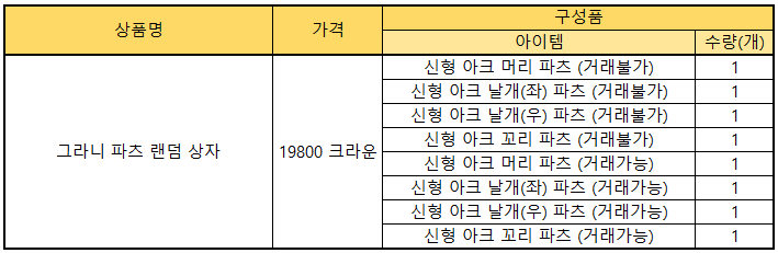 > [그라니 파츠 랜덤 상자]의 자세한 확률은 확률공개 탭을 확인해 주시기 바랍니다.